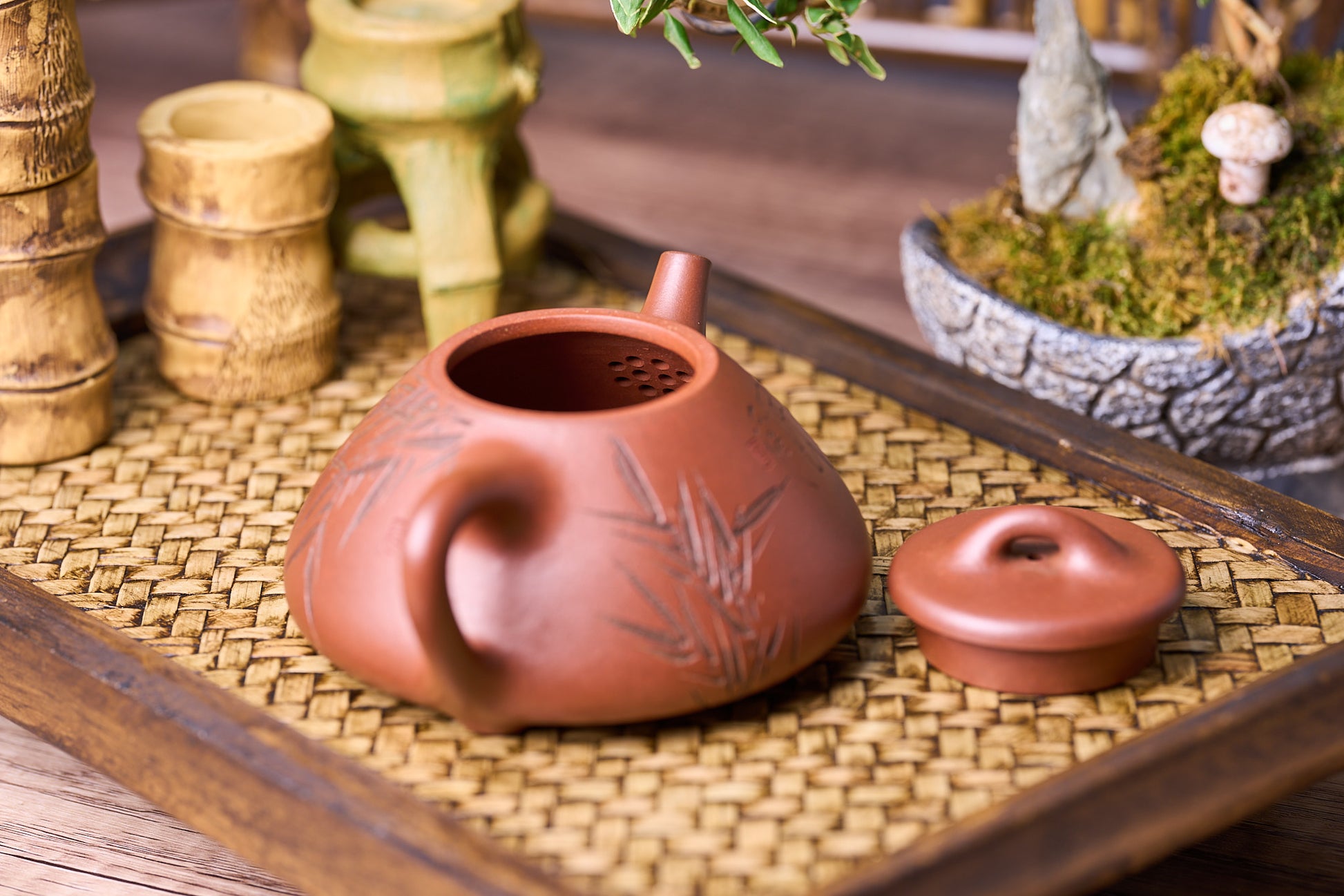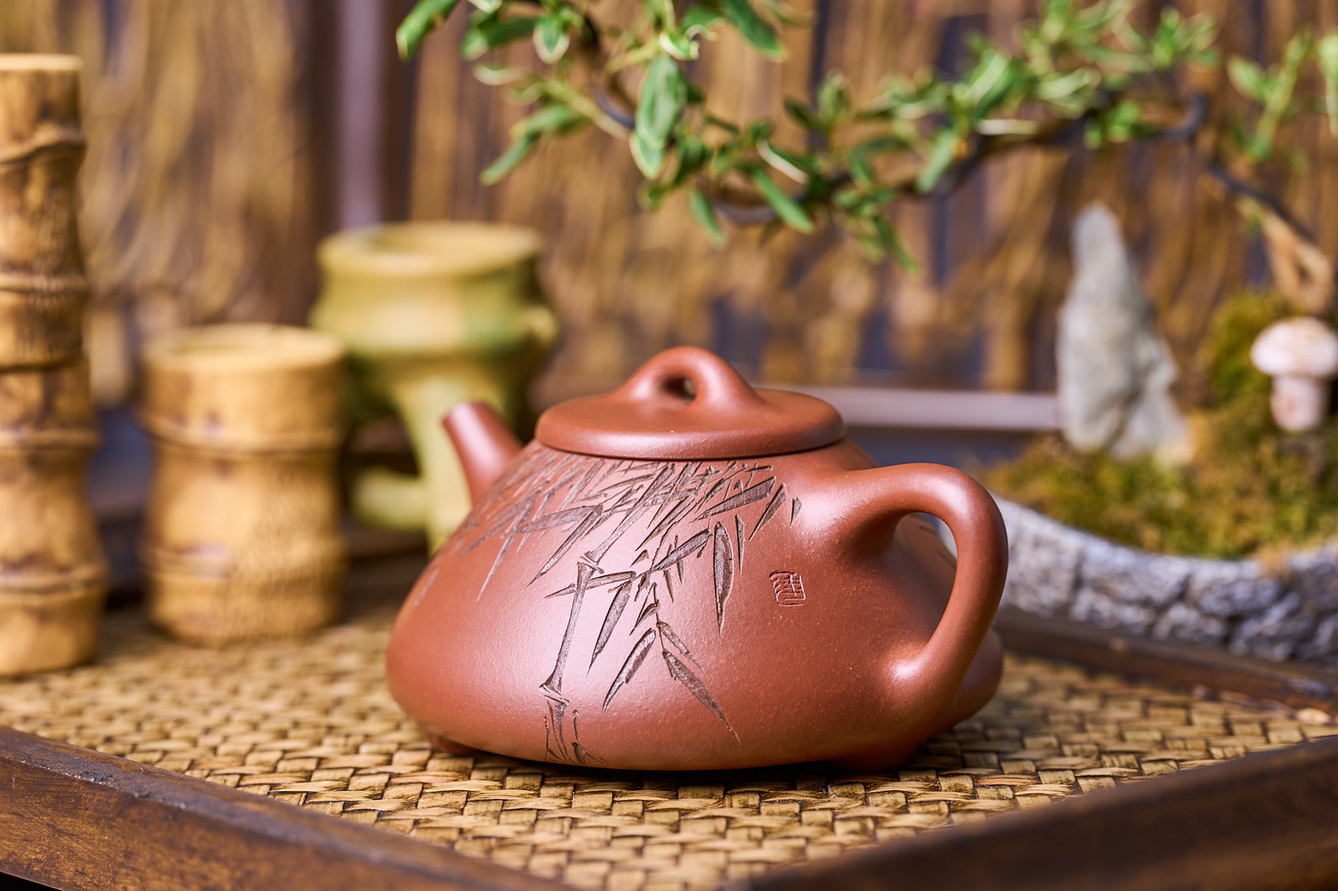 「レッドドラゴン」粘土手作りの子沙ティーポット Zi Zhi Shi Piao (子治石瓢) 強力な竹を彫刻したハイレベルの職人 Lu YiDan (陆轶丹)